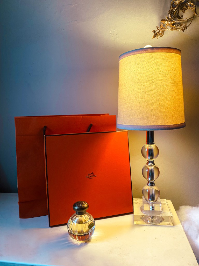 A clear bedside table displaying some favorite items give me “that feeling.”
