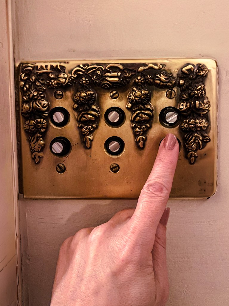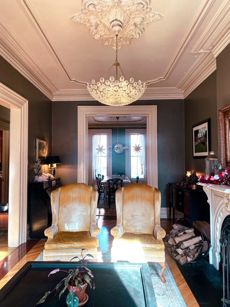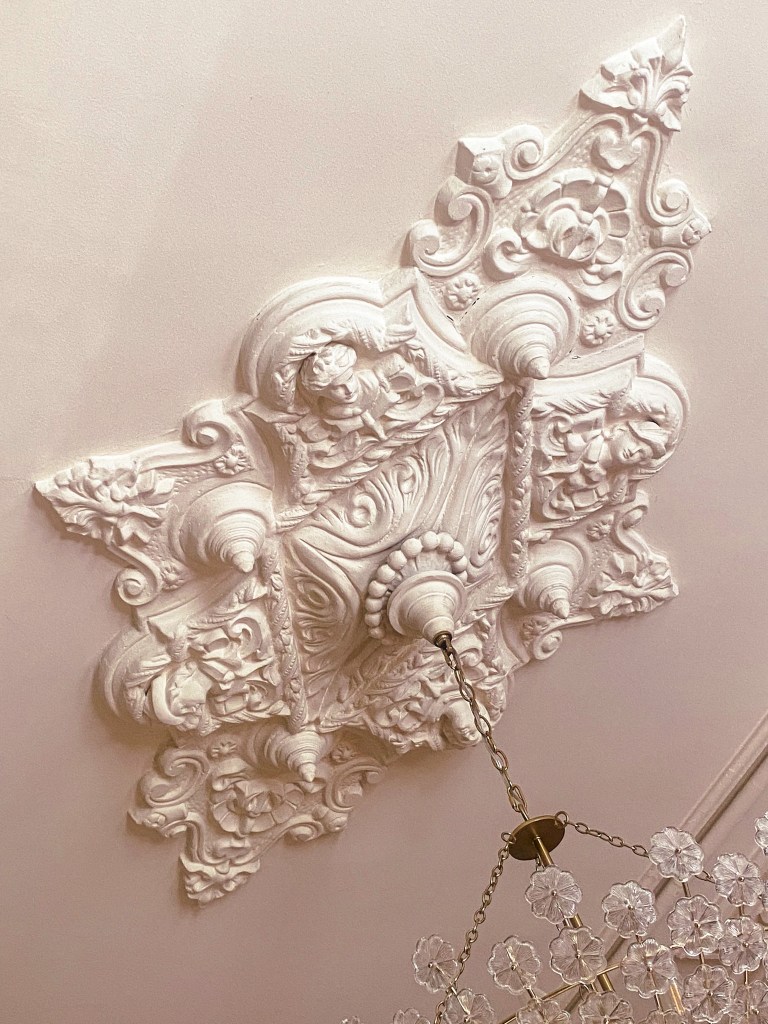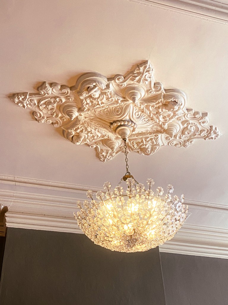 The day is finally here! I’ve wanted to change the lighting in the living and dining room for so long, that I can’t believe it has finally happened. Our 1877 Victorian townhome has the most stunning original plaster ceiling roses and layered crown moulding, yet the fixtures they spotlighted were just builder grade from Home Depot. It was basically a crime that the chandeliers were not anything original. I’m sure those were tossed as fashions changed. Now they would be worth…a lot. I looked! It’s as if the stage was set, but the one occupying the spotlight was a talentless cover band. Lighting is the jewelry of the room, but jewelry hasn’t been our focus….until now!