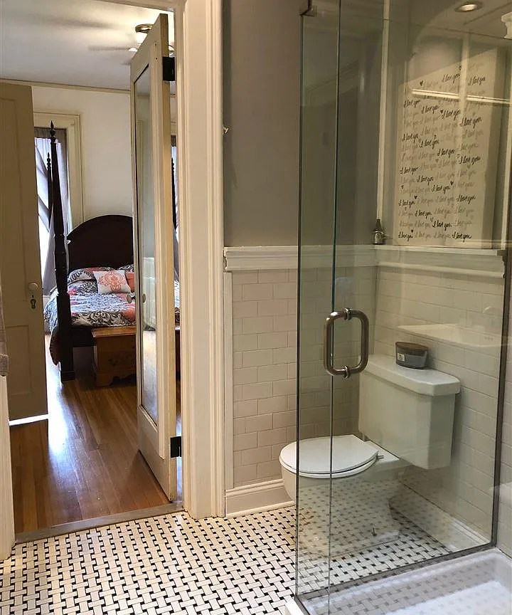Two falls ago, our shower wasn’t draining. We had our plumber come over to clear it, and while he was working on it upstairs, I suddenly heard and felt raindrops coming from the ceiling in the living room. It was a terrifying moment. The plumber came downstairs with a sheepish look on his face to bear the bad news…but inside I was exploding with excitement! I heard the internal shouting “this is a disaster”, but felt another voice telling me that we were about to be forced to finally upgrade our en suite bathroom!