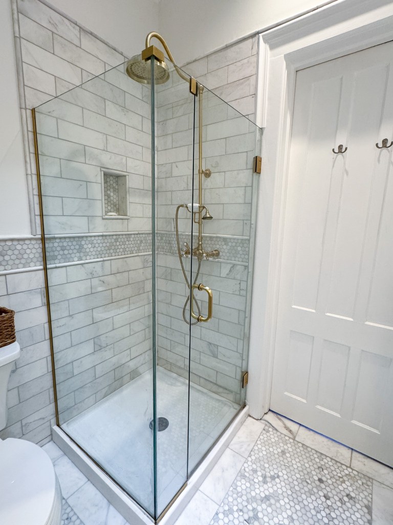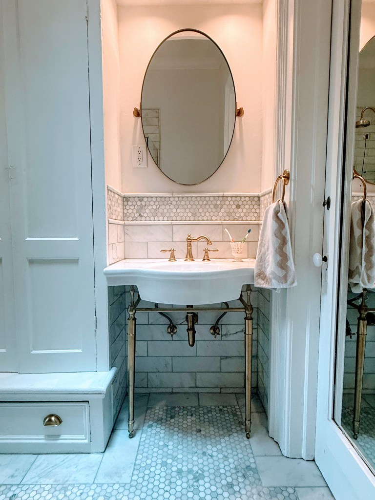 The timing was perfect because it was only in more recent years that I fell in love with the Victorian aesthetic of our neighborhood. We designed the bathroom to give a nod to history with an Edwardian style vanity sink with brass legs. We put polished brass on all the finishes and preserved the original antique cabinetry commonly found in historic New York townhouses. We did a bit of a faux paw mixing Carrara and Calcutta marble tile, but we hoped the opulence of marble on marble would lend to the grand style of our Victorian home.